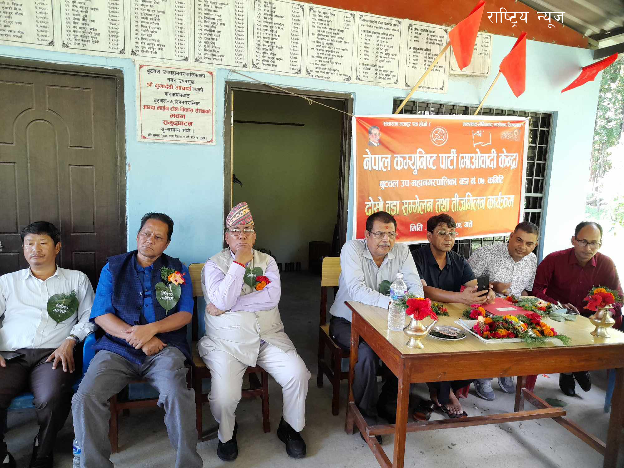नेकपा माओबादी केन्द्र बुटवल उपमहानगरपालिका वडा नं. ७ को दोश्रो वडा सम्मेलन शनिवार सम्पन्न भएको छ । सम्मेलनले डम्बर बहादुर गौचनको अध्यक्षतामा २१ सदस्यीय कमिटि गठन गरेको छ । जसको उपाध्यक्षमा बालकृष्ण भुसाल, सचिबमा मुक्ति अधिकारी,सहसचिब सिता कुँवर,कोषाध्यक्ष ससी पौडेल निर्बिरोध निर्वाचित रहेका छन । यस्तै १८ सदस्य निर्बिरोध निर्वाचित भएका छन भने ३ सदस्यलाई मनोनित गरिने निर्वाचन कमिटिले जानकारी दिएको छ । नेकपा माओबादी केन्द्रका केन्द्रीय सदस्य बामदेव क्षत्रीको प्रमुख आतिथ्यतामा कार्यक्रमको आयोजना गरिएको हो । कार्याक्रममा बोल्दै उहाँले २०८४ को निर्वाचनमा माओबादी केन्द्र एक्लै निर्वाचन लड्ने बताउनु भयो ।