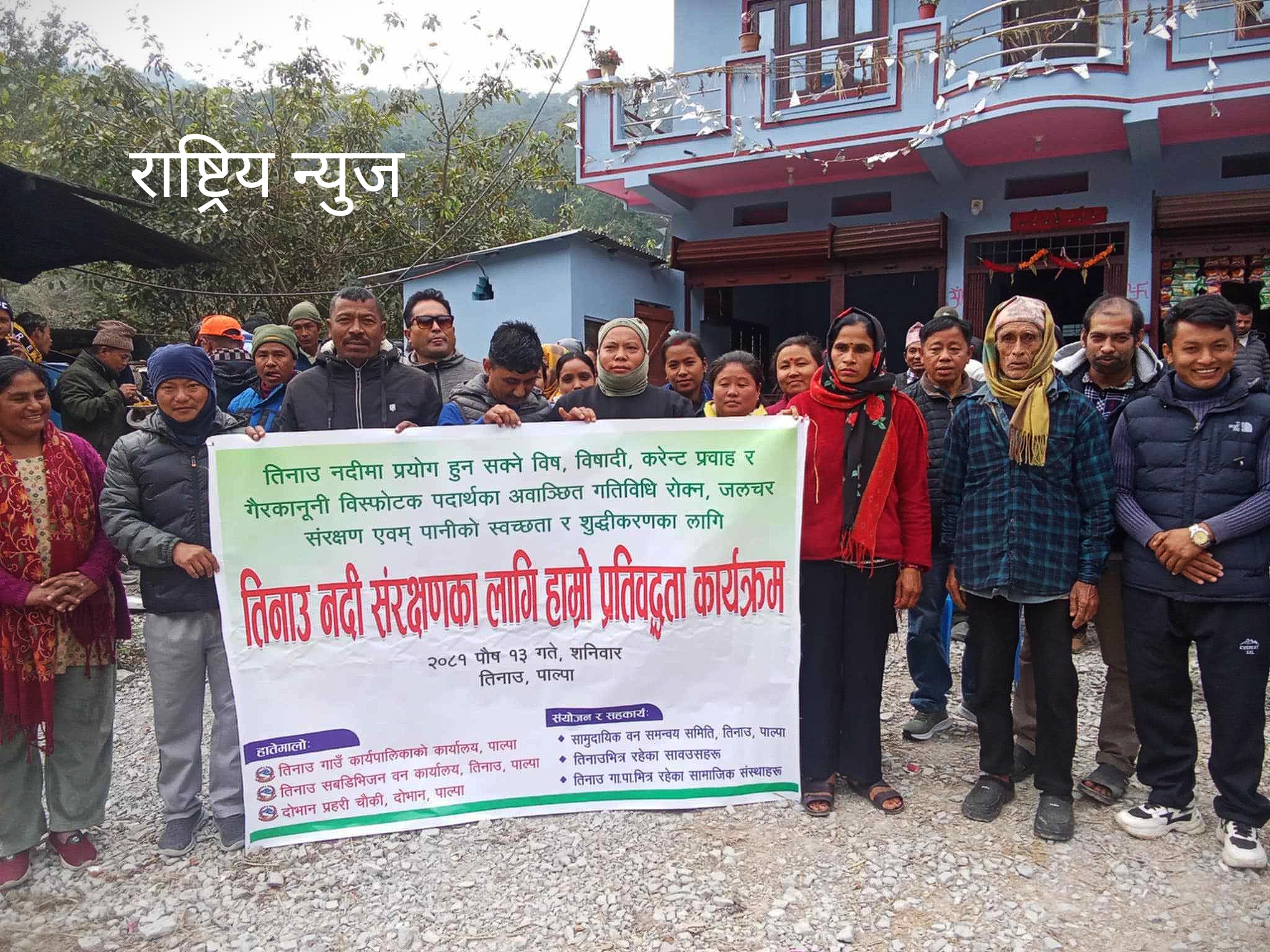 "तिनाउ नदी संरक्षणका लागि हाम्राे प्रतिवद्वता कार्यक्रम"पाल्पा,तिनाउ, दाेभानकाे टोलमा शनिवार सम्पन्न भएको छ। तिनाउ नदीमा विष,विषादी,विद्युत धाराप्रवाह र विफाेष्टक पदार्थकाे अवाञ्छित प्रयाेग हुन नदिनका लागि उपस्थित सबैले प्रतिवद्वता जनाउँदै हस्ताक्षर गरेका छन् ।