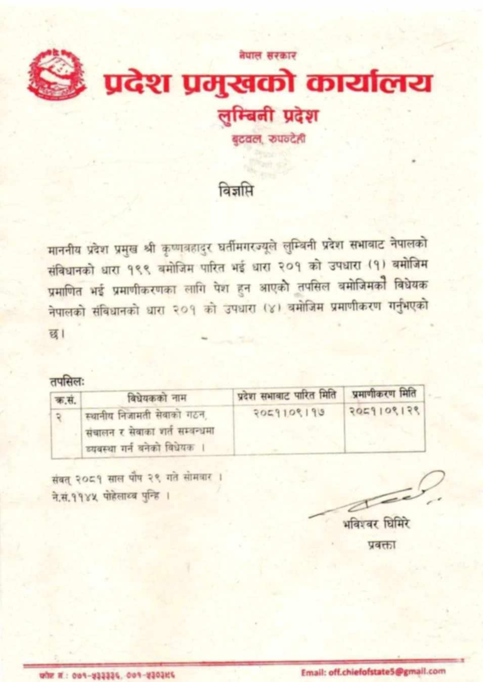 गत पौष १७ गते प्रदेश सभाबाट पारित भएको बिधेयक पौष २९ गते प्रदेश सभाका प्रदेश प्रमुख माननीय श्री कृष्णबहादुर घर्तीमगरले नेपालको संविधानको धारा २०१ को उपधारा (४) बमोजिम प्रमाणीकरण गर्नुभएको हो।
