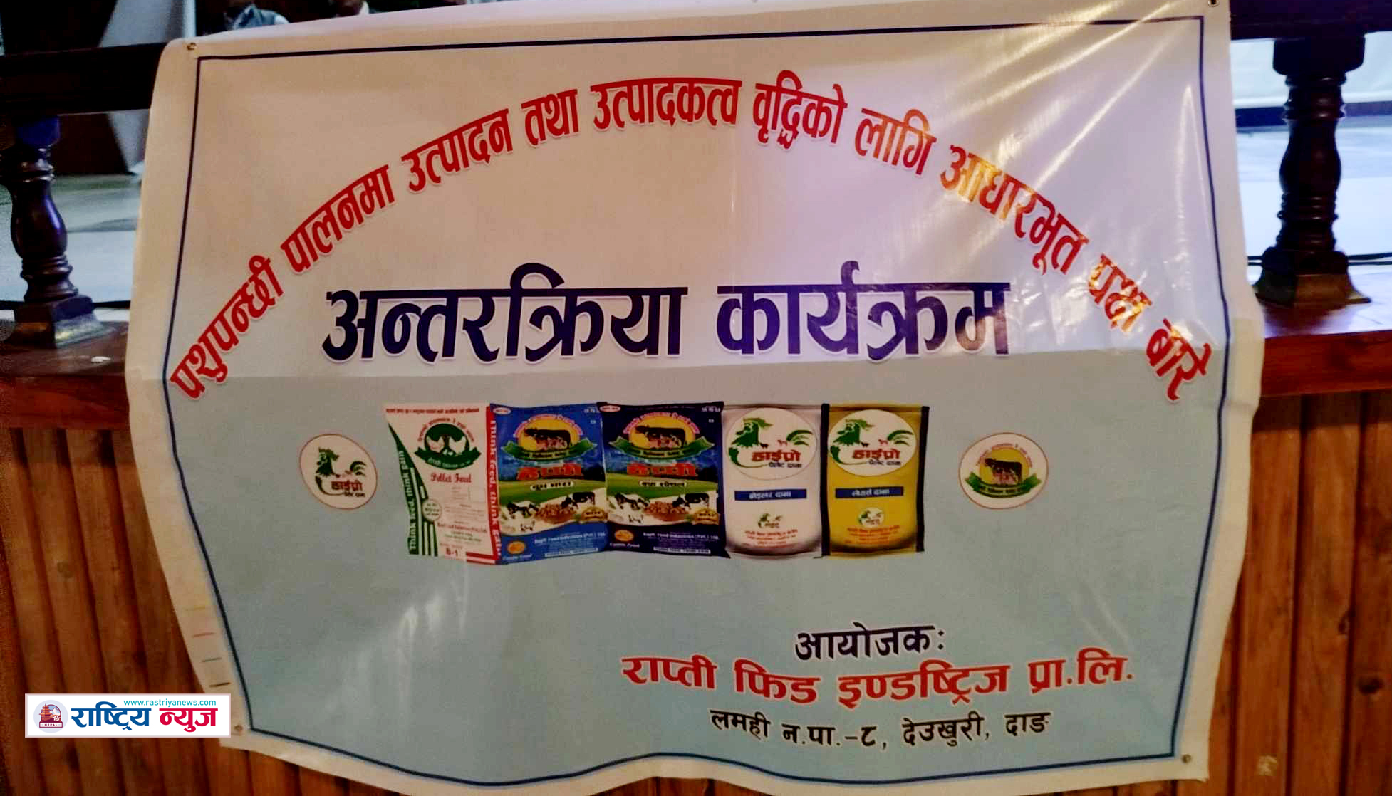 राप्ति फिड इण्डष्ट्रीज प्रा.लि. न.पा. ८, देउखरी दाङको आयोजना, सिताकुण्ड दुग्ध उत्पादक सहकारी संस्था रामपुर पाल्पाको व्यबसथापनमा भएको कार्यक्रमा, पशु विज्ञ हुमनाथ अर्याल, नेपाल बाख्रा पालन व्यबसायिक संघ केन्द्रीय उपाध्यक्ष सूर्य प्रसाद रेग्मी, श्रीकृष्ण उन्नत भैसी पालन श्रोत केन्द्र रामपुरका पशु पालक कृष्ण कुमार अर्यालले कृषकको समस्या, आहार व्यवस्थापन र पोषणको आवश्यकता रहेको समस्याका बारेमा आफ्ना धारणा राख्नु भएको थियो ।