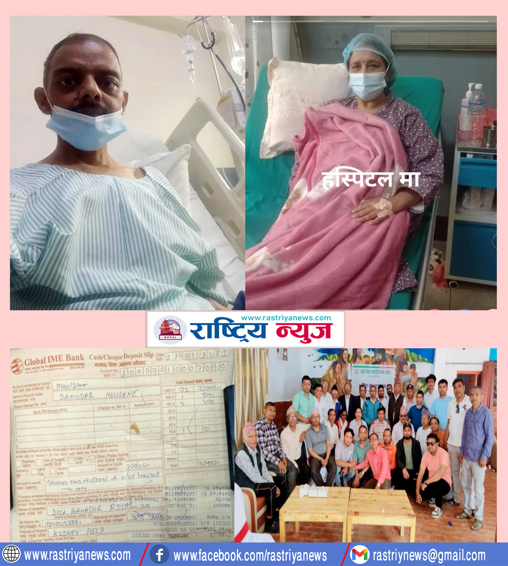 मृगौला पिडित दामोदर न्यौपानेलाई सहयोग गर्न चाहाने ब्याक्तिहरुको लागि सिधै उनको खातामा राख्न सकिनेछ। खातावालाको नाम :-