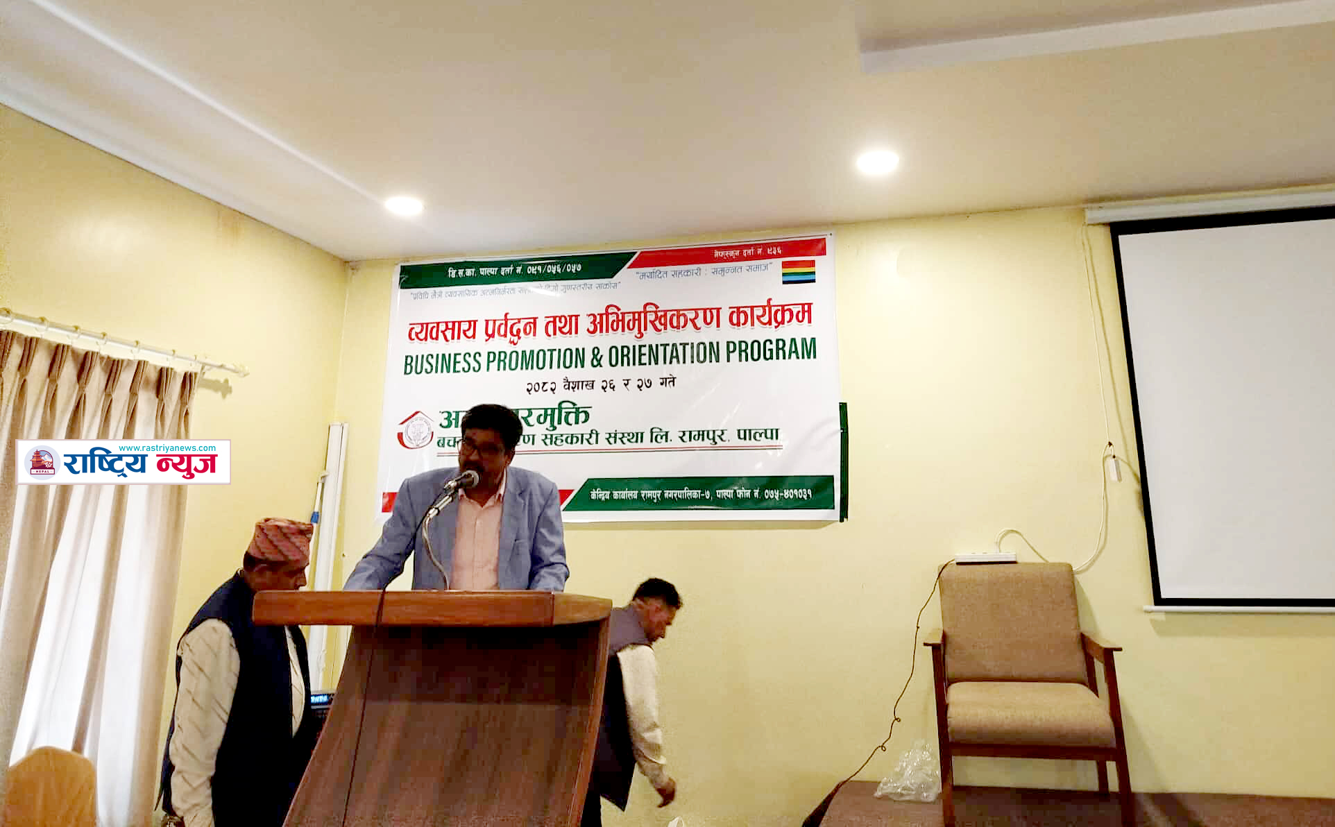 रामपुर-२०५५ सालमा रामपुर ५ डुम्रीगाउमा दैनिक ५० पैसा वचत संकलनबाट स्थापना गरिएको अन्धकार मुक्ति वचत तथा ऋण सहकारी संस्था लि. रामपुर पाल्पाले संस्थामा आवद्ध शेयर सदस्यहरुलाई व्यवसाय प्रवर्द्धन तथा अभिमुखिकरण कार्यक्रम सम्पन्न गरेको छ ।