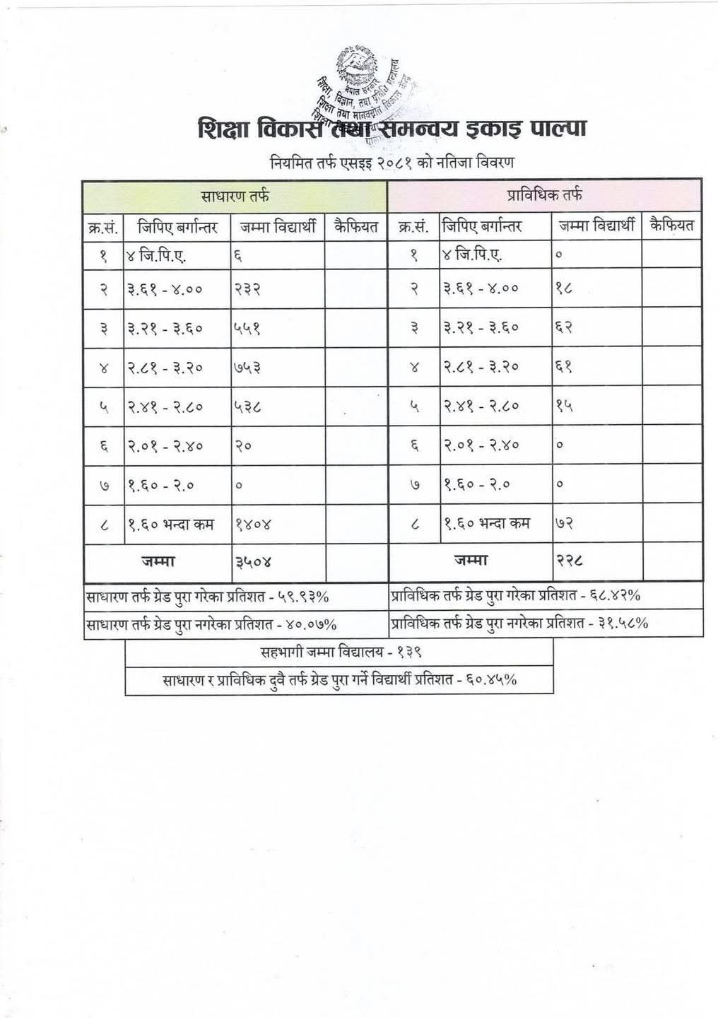शिक्षा विकास तथा समन्वय इकाइ पाल्पाका बोम बहादुर थापाका अनुशार जिल्लाका १३९ विद्यालयबाट परीक्षामा सहभागी विद्यार्थी मध्ये ६० दशमलव ४५ प्रतिशतले ग्रेड पुरा गरेका छन् ।नियमित साधारण तर्फ ५९ दशमलव ९३ प्रतिशत र प्राविधिक तशार र्फ ६८ दशमलव ४२ प्रतिशत विद्यार्थीले ग्रेड पुरा गरेको थापाले जानकारी दिनु भयो ।नतिजा अनुसार साधारण तर्फ ४ जीपीए ल्याउने विद्यार्थी ६ जना, ३.६१ देखि ४ जीपीए ल्याउने २३२ जना, ३.२१ देखि ३.६० जीपीए ल्याउने ५५१ जना, २.८१ देखि ३.२० ल्याउने ७५३ जना, २.४१ देखि २.८० जीपीए ल्याउने ५३८ जना, २.०१ देखि २.४० जीपीए ल्याउने २० जना, १.६० देखि २.० ल्याउने शुन्य र १.६० जीपीए भन्दा कम ल्याउने विद्यार्थी संख्या १ हजार ४ सय ४ रहेको छ । प्राविधिक तर्फ चार जीपीए ल्याउने विद्यार्थी शुन्य, ३.६१ देखि ४ जीपीए ल्याउने १८ जना, ३.२१ देखि ३.६० जीपीए ल्याउने ६२ जना, २.८१ देखि ३.२० ल्याउने ६१ जना, २.४१ देखि २.८० जीपीए ल्याउने १५ जना र १.६० जीपीए भन्दा कम ल्याउने विद्यार्थी संख्या ७२ जना रहेको छ ।