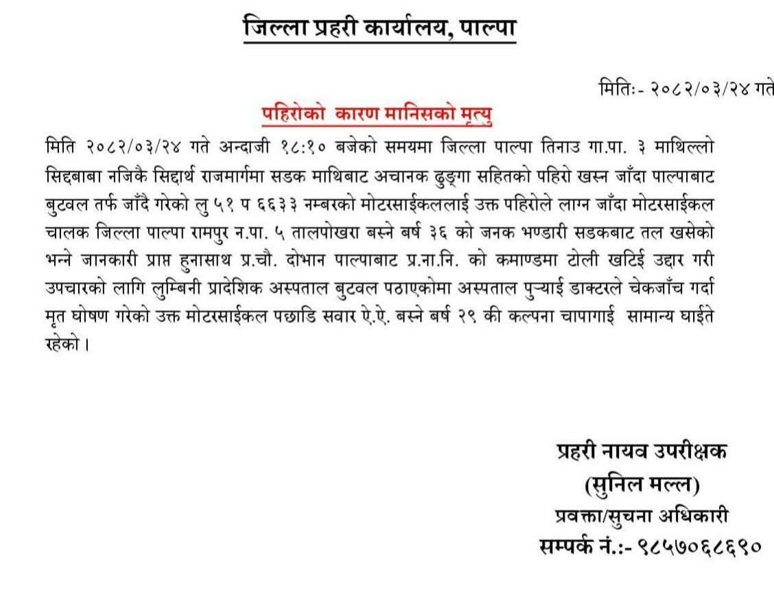 मंगलबार बेलुकी ६ बजेतिर बुटवलबाट पाल्पातर्फ आउने क्रममा तिनाउ गाउँपालिका–३, माथिलो सिद्दबाबा नजिकै माथिबाट खसेको पहिरोले लु ५१ प ६६३३ नम्बरको मोटर साइकललाई लागेको थियो । पहिरोले लागेर मोटरसाइकलमा सवार भण्डारी ३० मिटर तल उछिट्टिएकाे प्रहरी उपरीक्षक मल्लले बताउनुभयाे । घटनास्थलबाट उद्दार गरी लुम्विनी प्रादेशिक अस्पतालमा पठाइएपनि भण्डारीकाे मृत्यु भइसकेकाे थियाे । अहिले लुम्विनी प्रादेशिक अस्पतालमा घाइतेको उपचार भइरहेको प्रहरीले जनाएको छ ।
