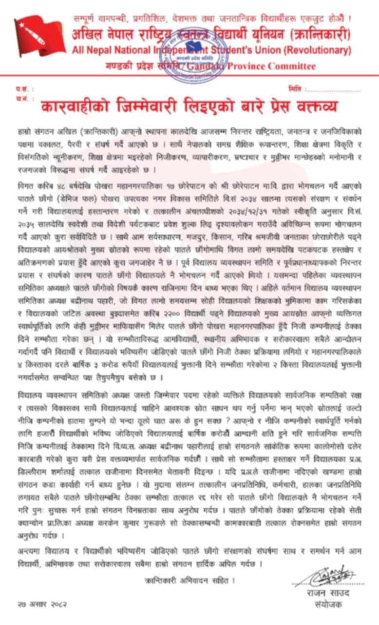अखिल क्रान्तिकारी गण्डकी प्रदेश संयोजक राजन साउदले विज्ञप्ति निकालेर घटनाको जिम्मा लिँदै सांकेतिकरूपमा कारबाही गरेको दाबी गरेका छन् । उनले सम्झौतामा हस्ताक्षर गर्ने प्रअ विल्लीराम शर्मालाई समेत राजीनामा दिन चेतावनी दिएका छन् ।