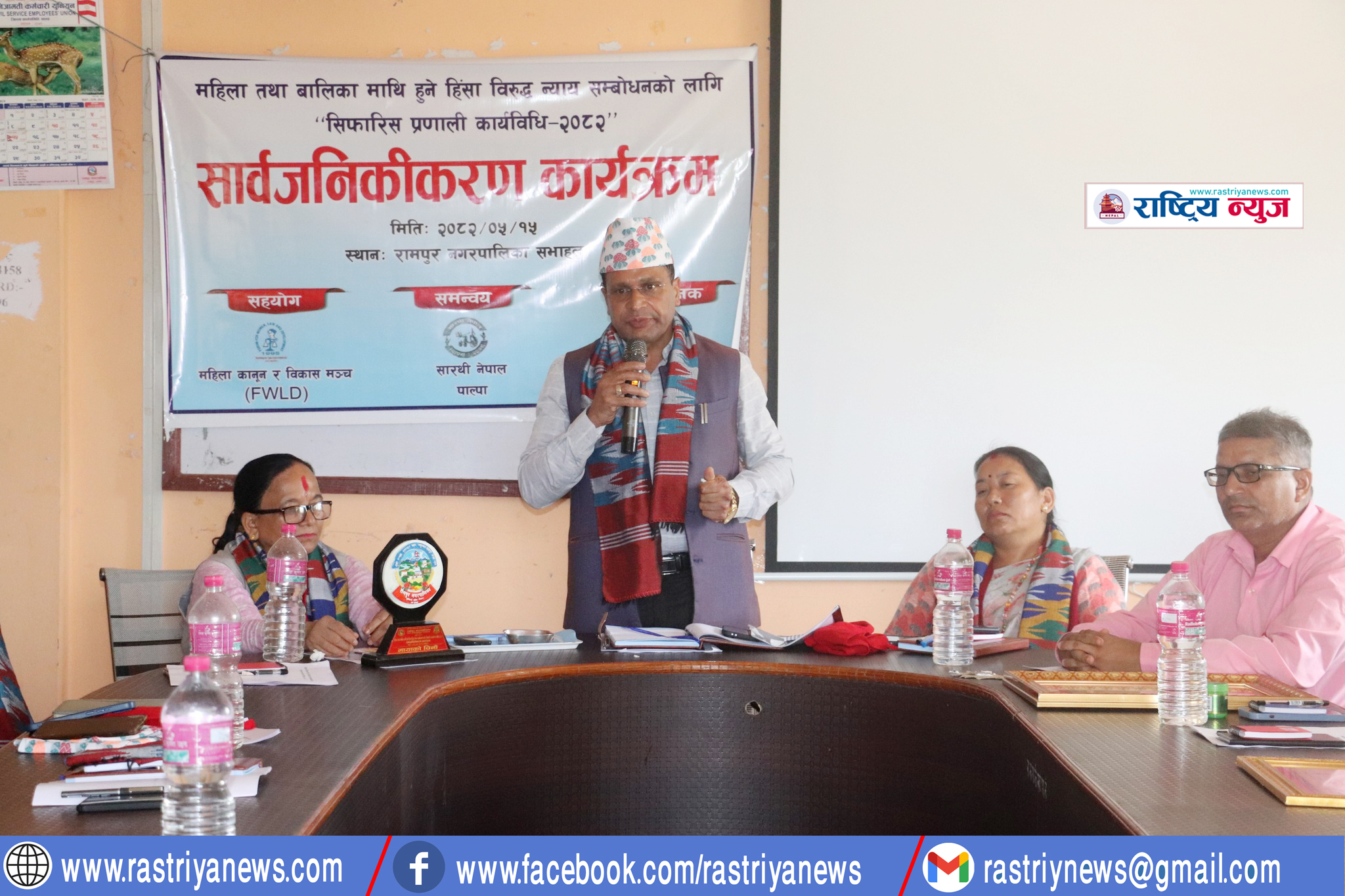 राष्ट्रिय न्युज–रामपुर पाल्पा, महिला बालबालिका माथि हुने हिंसा विरुद्ध न्याय सम्बोधनका लागि सिफारिस प्रणाली कार्यविधि–२०८२” रामपुर नगरपालिकाले सार्वजनिक गरेको छ । घरेलु हिंसा प्रभावित महिला तथा बालबालिकालाई छिटो, छरितो र प्रभावकारी सेवा उपलब्ध गराउन महिला कानुन र विकास मञ्चको सहयोग र सारथी नेपाल पाल्पाको समन्वयमा तयार गरिएको कार्यविधि आइतबार सार्वजनिक गरेको हो ।