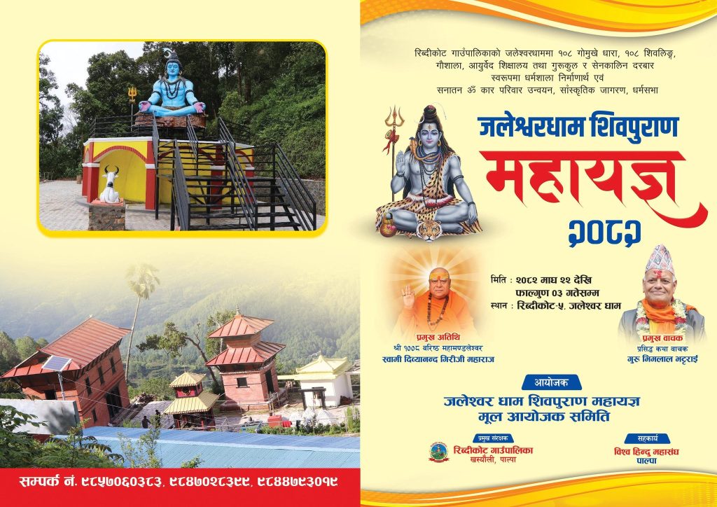 राष्ट्रिय न्युज - पाल्पा जिल्लाको बगनासकाली गाउँपालिका–८, बराङ्गदीस्थित महामृत्युञ्जय शिवासन धाममा माघ २९ गतेदेखि फाल्गुन ३ गतेसम्म चार दिनसम्म महाशिवरात्रि विशेष भव्य धार्मिक अनुष्ठान आयोजना हुने भएको छ। आयोजकको अनुसार यस पावन अवसरमा देश–विदेशका शिवभक्तजनको सहभागितासँग कार्यक्रम सञ्चालन गरिनेछ।