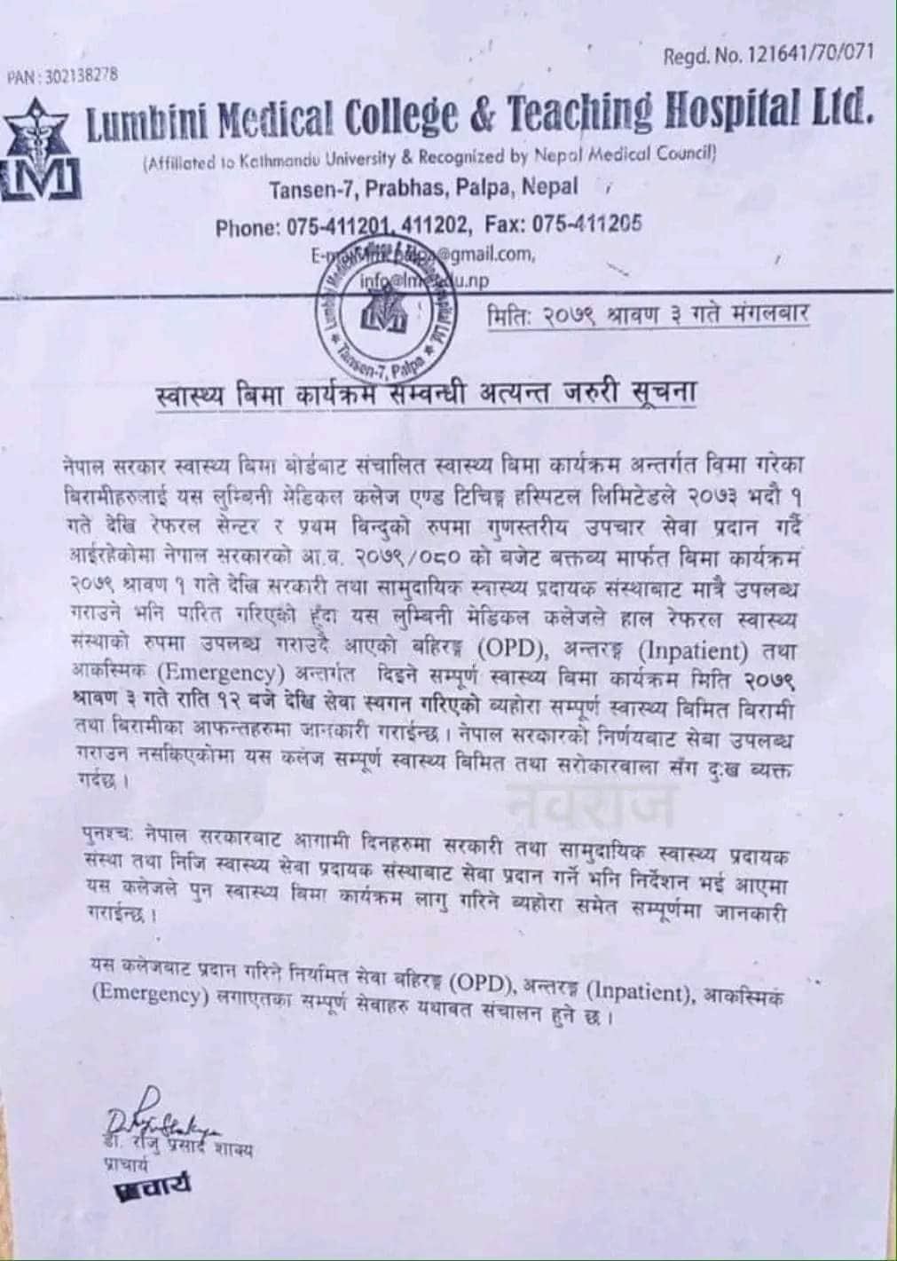 जिल्लाको ठुलो नीजि अस्पतालको रुपमा रहेको लुम्बिनी मेडिकल कलेजले साउन ३ गते राति १२ बजे देखि अस्पतालमा स्वास्थ्य बिमा अन्र्तगत हुने उपचार सेवा स्थगित हुने जानकारी सेवाग्राही तथा आम सर्वसाधारणमा जानकारी गराएको छ । सरकारले आ.व २०७९/०८० को नीति तथा कार्यक्रमबाट स्वास्थ्य वीमा कार्यक्रम सरकारी तथा सामुदायिक अस्पतालमा मात्र लागू हुने निर्णय गरेको भन्दै अस्पतालले वीमा सेवाबाट उपचार नदिने जनाएको छ । यो सँगै कलेजबाट ओपिडि, आकस्मिक तथा सबै फाँटबाट हुने स्वास्थ्य बिमा अन्र्तगतको सेवा बन्द गरेको अस्पतालले जनाएको छ ।