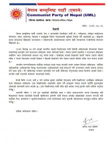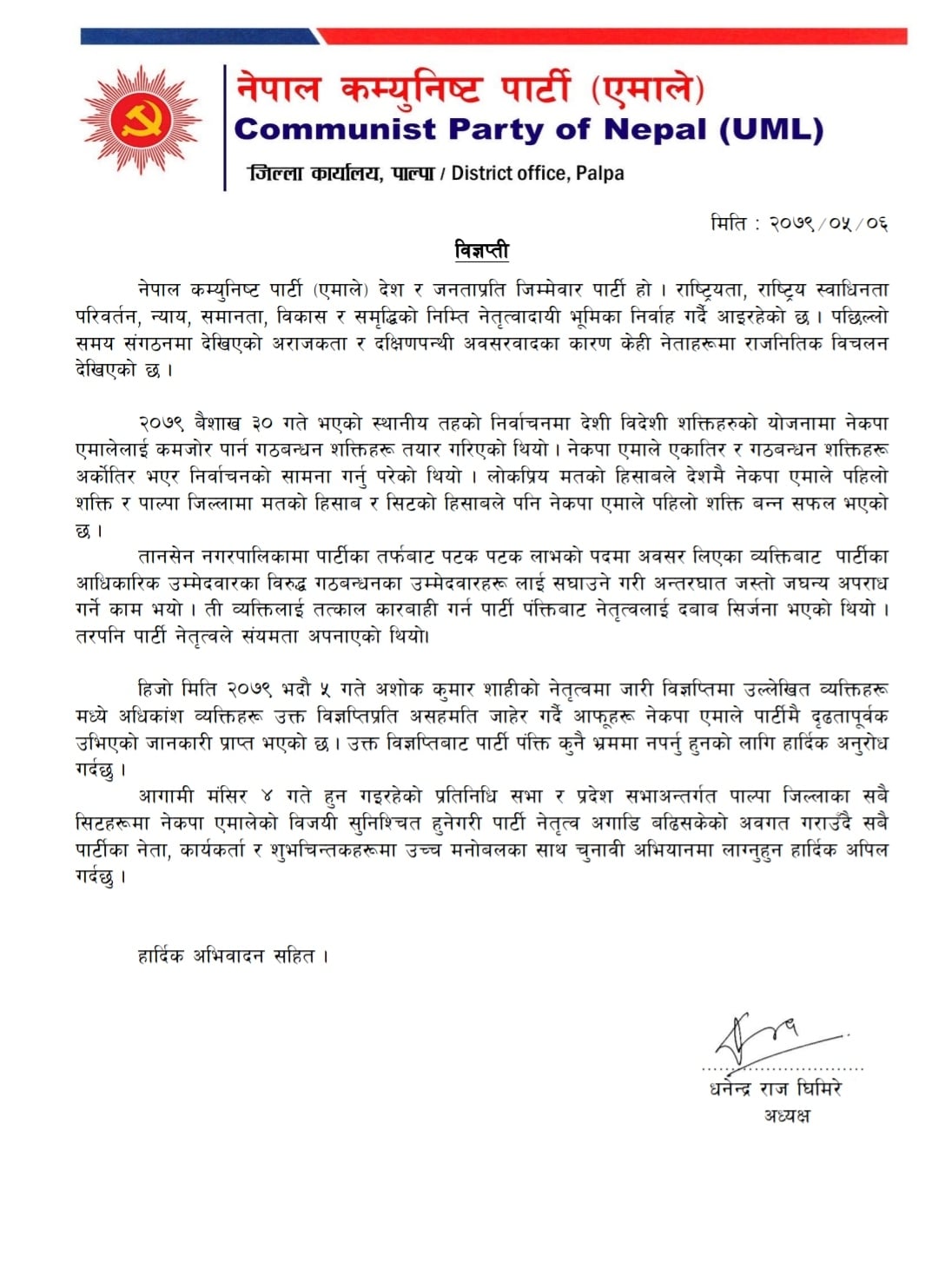 एमाले पाल्पाले सोमबार विज्ञप्ति निकाल्दै अन्तरघातीले पार्टी छाडेको जनाएको छ । स्थानीय तहको निर्वाचनमा पार्टीका आधिकारिक उम्मेदवारलाई हराउन गठबन्धनसँग मिलेर अन्तरघात गरेका केही व्यक्तिहरूले पार्टी छाडेर गएको जिल्ला पार्टी अध्यक्ष धनेन्द्रराज घिमिरेले जारी गरेको विज्ञप्तिमा उल्लेख छ । तानसेन नगरपालिकामा पार्टीका तर्फबाट पटक पटक लाभको पदमा अवसर लिएका व्यक्तिबाट पार्टीका आधिकारिक उम्मेदवारविरुद्ध गठबन्धनका उम्मेदवारलाई सघाउने गरी अन्तरघात जस्तो ‘जघन्य अपराध’ गर्ने काम भएको विज्ञप्तिमा उल्लेख छ ।
