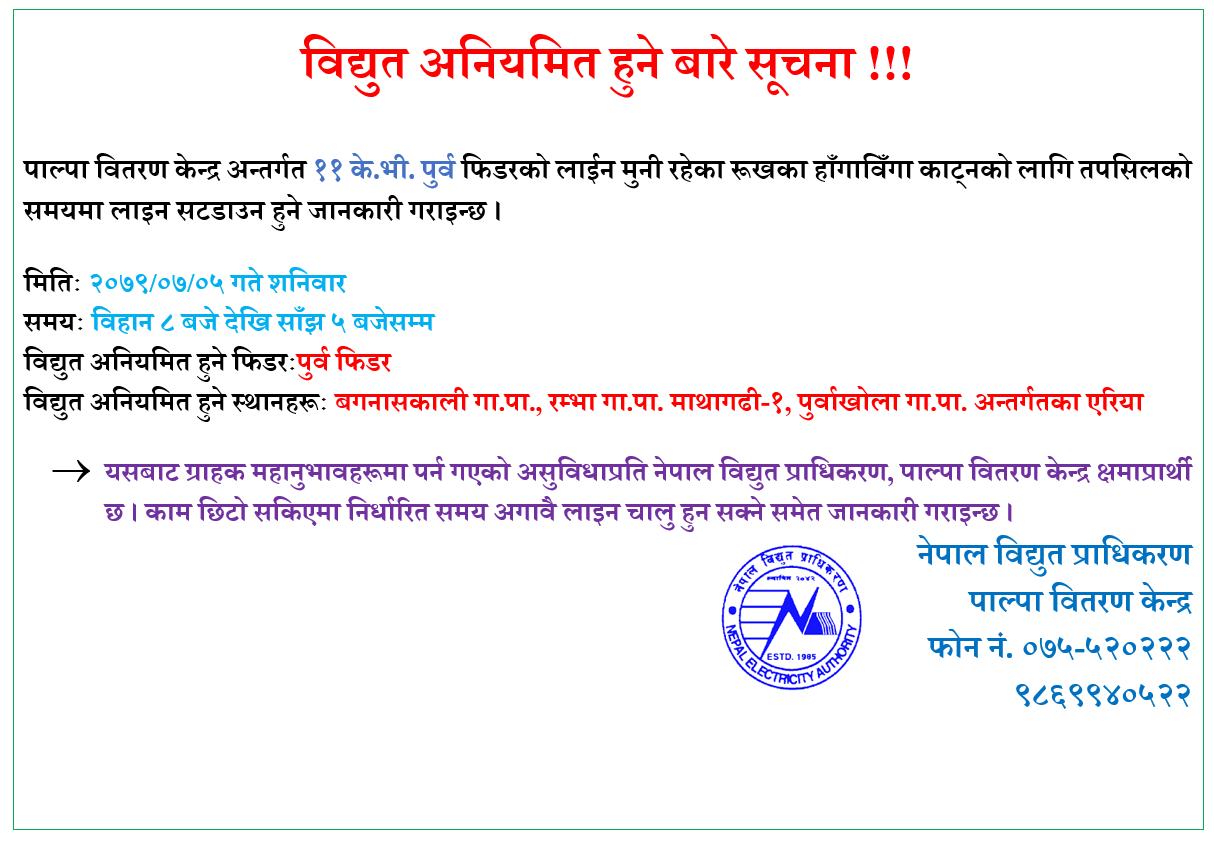 पाल्पाको पूर्वी फिडरमा शनिवारका दिन विद्युत अनियमित हुने भएको छ ।