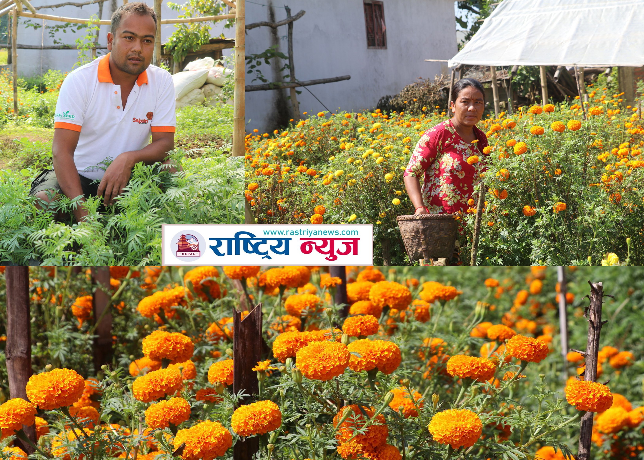 पाल्पामा कुनै समय करेसाबारी र आँगनको शोभाका रुपमा लगाइने फूल अहिले व्यावसायिक रुपमा लगाउन थालिएको छ । विभिन्न कार्यक्रम र उत्सवहरुमा समेत फूलको मालाको प्रयोग वढ्न थालेपछि व्यावसायिक रुपमा फूलको खेति सुरु हुन थालिएको हो । जिल्लाको माथागढी गाउँपालिका वडा नं. २ रूप्सेकी गीता घर्ती थापाले अहिले व्यावसायिक रुपमा फुलको खेतिको सुरुवात गरेकी छन् । तिहारको आगमनसँगै फुलको मालाको माग अत्याधिक वढ्ने भएकाले उत्पादनमा समेत वृद्धि भएको छ । विगतका समय घरको चुलो चौकोमा सिमीत हुदै आएकी गीता थापा अहिले आफ्नो घर नजिकै खेतवारीमा रहर लाग्दो सय पत्री तथा हजारीफुल संग रमाउदै ब्यवसायी फुलखेतीमा रमाउदै छिन् । माध्यमिक तहको पढाई सकेर विहेवारी भएको थापाले सामाजिक सञ्चालनबाटै सिकेर फुल खेती गरेको बताउछिन् । बजारमा विशेष गरी तिहारको बेला कृत्रिम रबरका माला तथा भारतवाट आयातित फुल मालाले वर्चस्व कायम गरिरहेको अवस्थामा ति फुललाई निरुत्साहित गर्न आफुले ब्यावसायीक रुपमा फुल खेती गरेको थापाले बताइन् । तिहार नजिकीएकाले गर्दा पनि यति खेर घर्ती थापालाई फुल टिप्न र माला गास्न भ्याई नभ्याई छ । थापाले माराखोप बहुउद्देश्यीय कृषि फर्म दर्ता गरि पहिलो वर्ष १ रोपनी क्षेत्रफलवाट फुलखेतीको सुरुवात गरी अहिले ३ रोपनीमा खेती गर्दे आएको र वार्षिक २ लाख सम्म आम्दानी हुने वताउछिन् ।