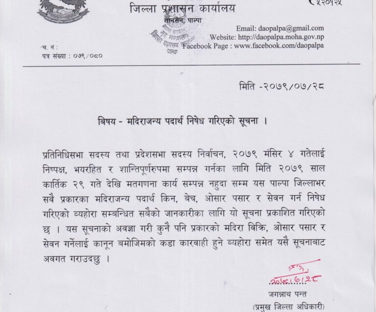 पन्थले भोली कार्तिक २९ गतेदेखि प्रतिनिधि तथा प्रदेश सभाको निर्वाचन सम्पन्न भएर मतगणना नसकिदा सम्म पाल्पामा कुनै पनि प्रकारको मदिरा खरिद विक्री, ओसार पोसार र सेवन गर्न निषेध गरिएको र कसैले सूचना विपरित काम गरेमा प्रचलित कानून बमोजिम कारवाही समेत गरिने जानकारी विज्ञप्तीमा मार्फत जानकारी गराउनु भयो ।