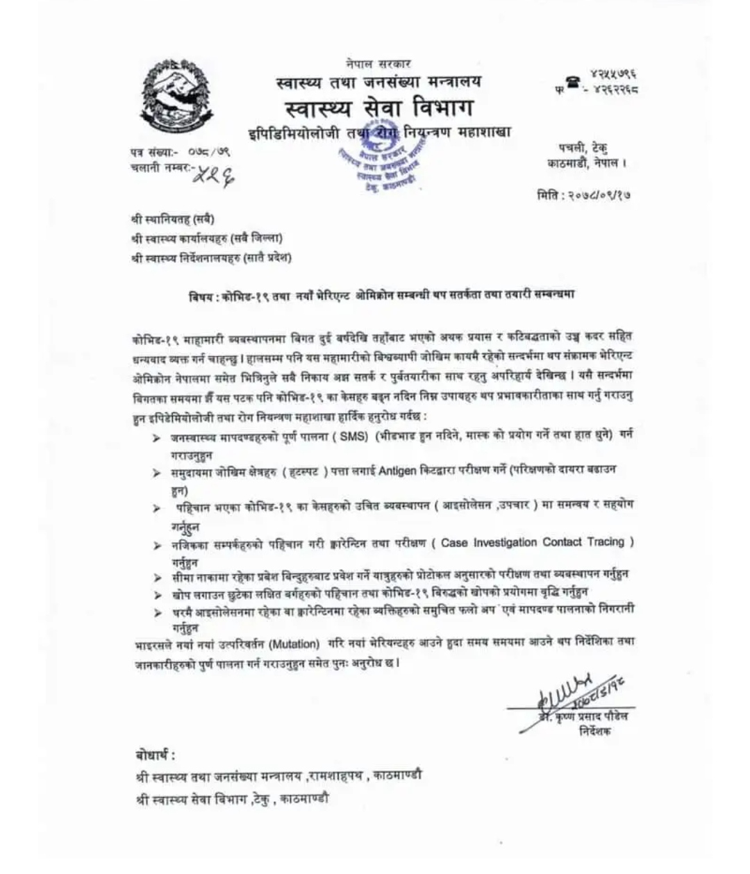 स्वास्थ्य तथा जनसंख्या मन्त्रालयले कोभिड–१९ तथा नयाँ भेरिएन्ट ओमिक्रोन फैलन नदिन देशभरका स्थानीय तह, प्रदेश सरकार र स्वास्थ्य कार्यालयहरूलाई थप सर्तकता अपनाउन आग्रह गरेको छ ।