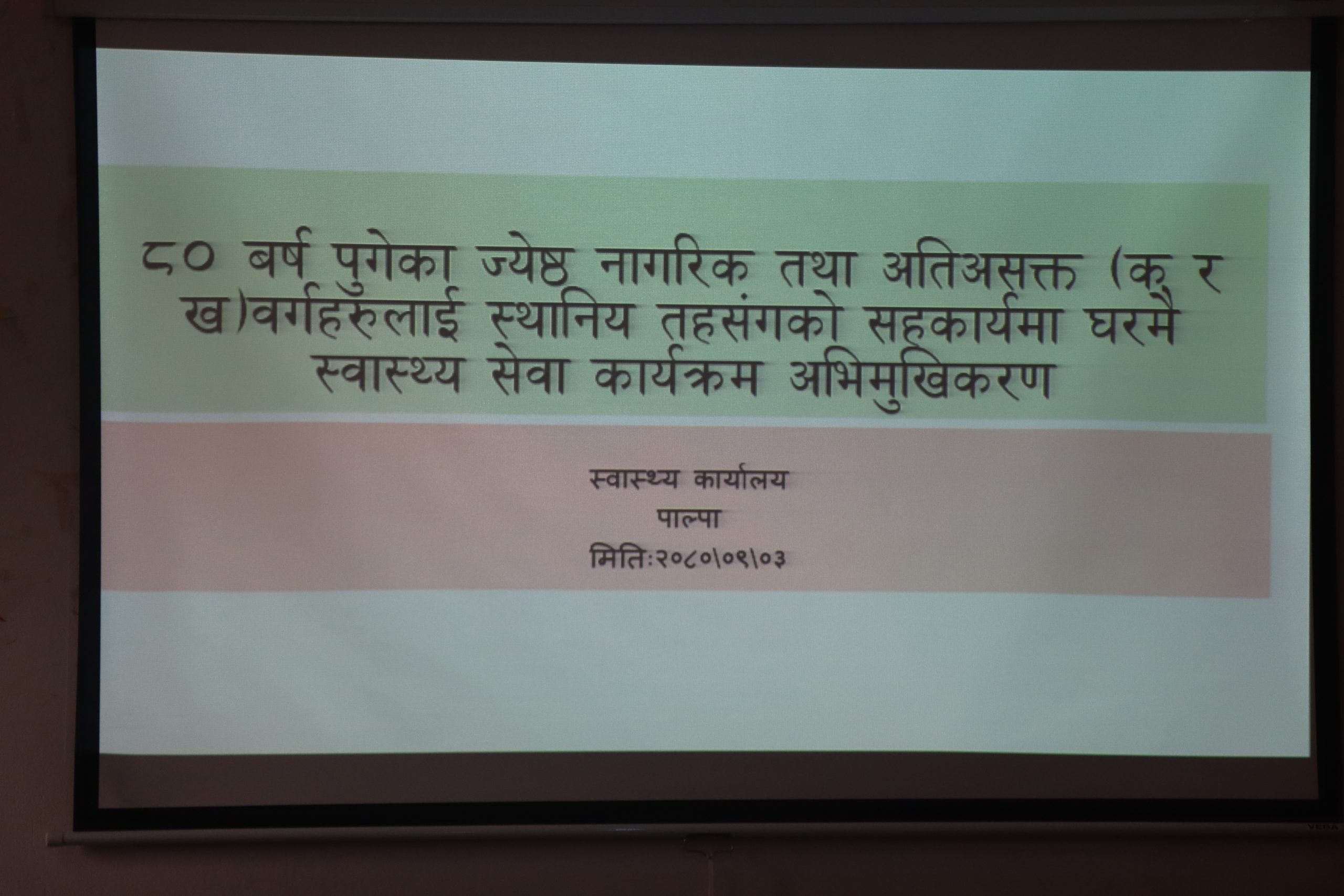 पाल्पा–पाल्पामा जेष्ठ नागरिक तथा अतिरिक्त (क र ख) वर्गहरुलाई घरमै पुगेर उपचार सेवा प्रदान गर्ने भएको छ। जिल्लाका १० वटै स्थानीय तहमा पुसको चौथो हप्तादेखि सेवा सुरु गर्न भएको हो।