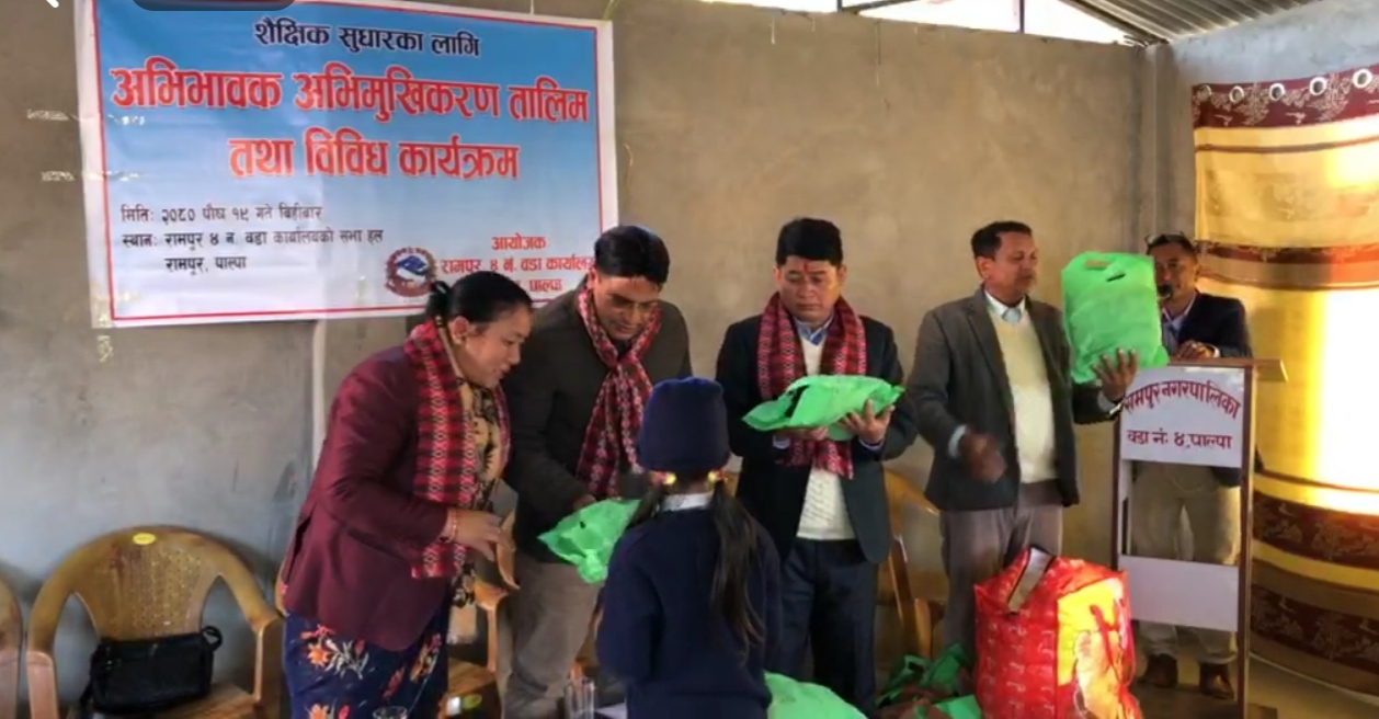 पाल्पा–रामपुर नगरपालिकामा अभिभावक अभिमुखिकरण तालिम संगै न्यानो कपडा तथा स्काउट पोशाक वितरण कार्यक्रम सम्पन्न भएको छ । ४ नं. वडा कार्यालयले शैक्षिक सुधारका लागि अभिभावकलाई अभिमुखिकरण संगै विद्यार्थीलाई न्यानो कपडा सहित पोशाक वितरण गरेको हो ।