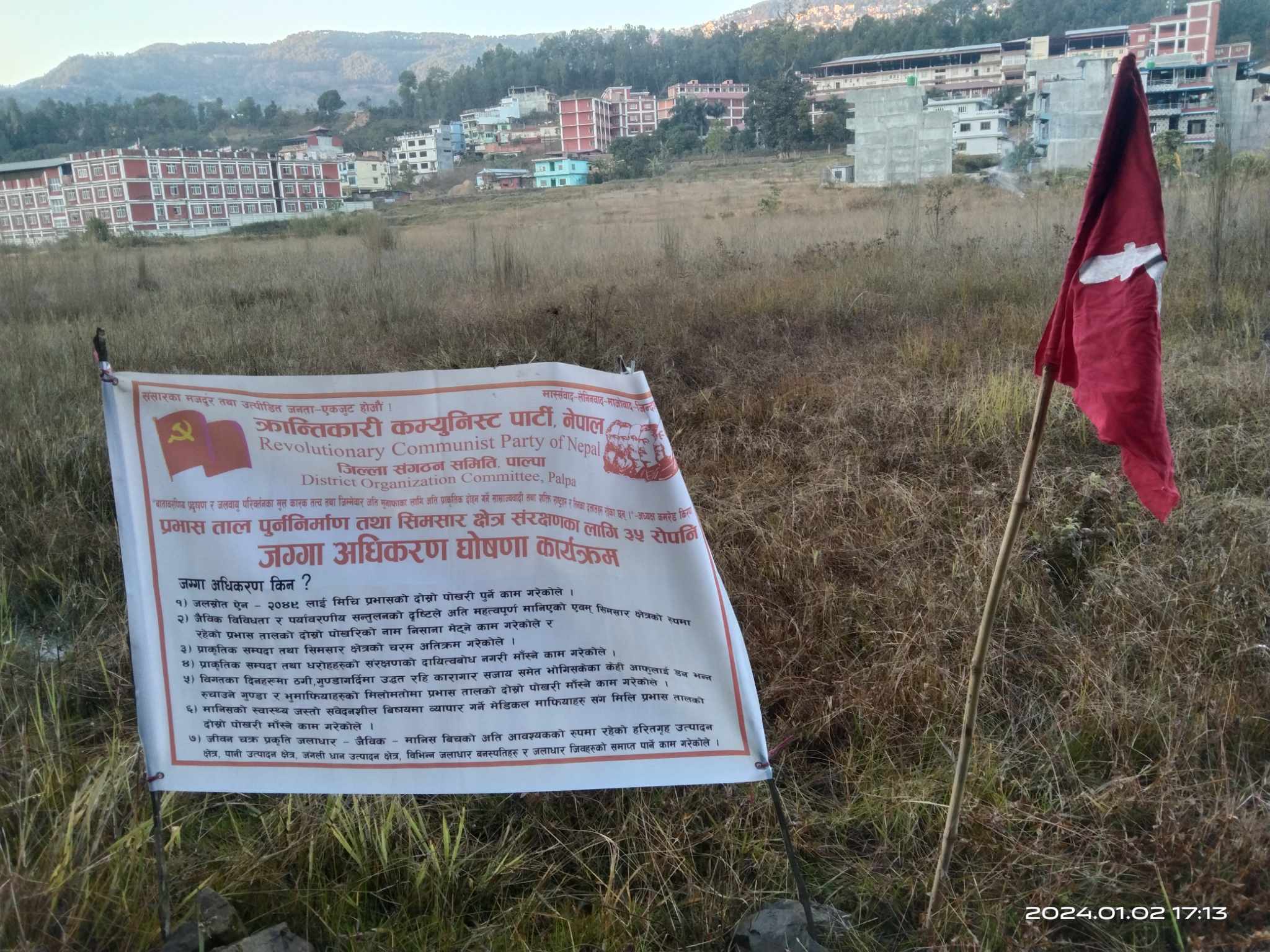 पाल्पा–क्रान्तिकारी कम्युनिस्ट पार्टी नेपाल पाल्पाले तानसेन नगरपालिका–७ प्रभास क्षेत्रको ३५ रोपनी जग्गा कब्जा गरेको जनाएको छ । ताल पुनर्निर्माण तथा सिमसार क्षेत्र संरक्षणका लागि ३५ रोपनी जग्गा अधिकरण घोषणा गरिएको पार्टीले प्रेस विज्ञप्ती मार्फत जनाएको छ ।