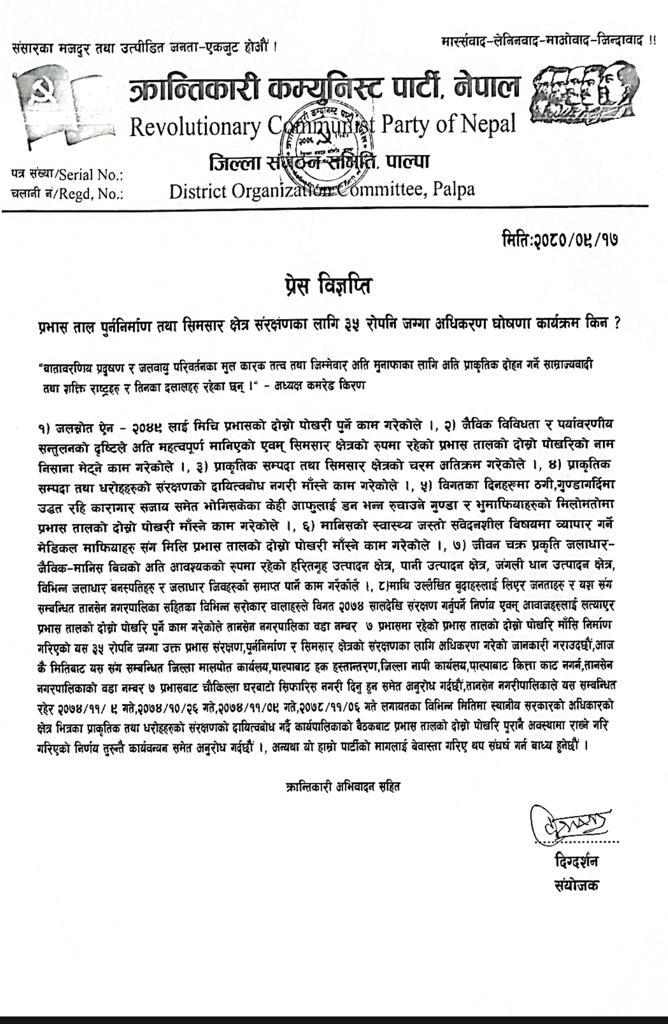 पार्टीले उक्त ३५ रोपनी जग्गा उक्त प्रभास संरक्षण, पुनर्निर्माण र सिमसार क्षेत्रको संरक्षणका लागि अधिकरण गरेको जनाएको छ । मालपोत कार्यलयबाट हक हस्तान्तरण, जिल्ला नापी कार्यालयबाट कित्ताकाट नगर्न, तानसेन नगरपालिकाको वडा नम्बर ७ प्रभासबाट चौकिल्ला घरबाटो सिफारिस नगरी दिन समेत पार्टीले अनुरोध गरेको छ । पार्टीले मागलाई बेवास्ता गरिए थप संघर्ष गने क्रान्तिकारी कम्युनिस्ट पार्टीले जनाएको छ ।