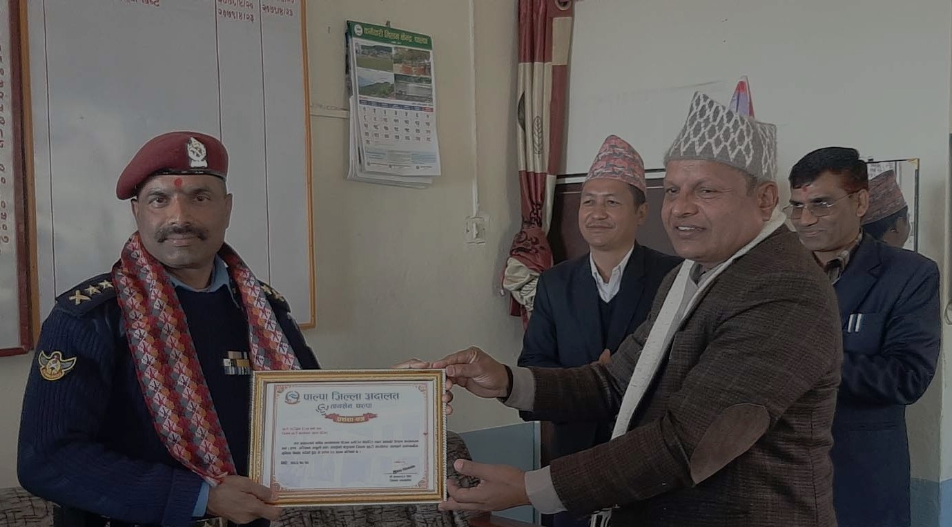 पाल्पा – जिल्ला अदालत पाल्पाको फैसला कार्यान्वयनमा महत्वपूर्ण भूमिका खेलेको भन्दै जिल्ला प्रहरी कार्यालय पाल्पाका प्रमुखलाई सम्मान गरेको छ । आपराधिक घटना लगत्तै र अदालतको फैसलापछि पनि फैसला कार्यान्वयनमा सक्रिय भूमिका खेलेको भन्दै जिल्ला प्रहरी कार्यालय पाल्पाका प्रमुख हेरम्व शर्मालाई अदालतले सम्मान गरेको हो ।