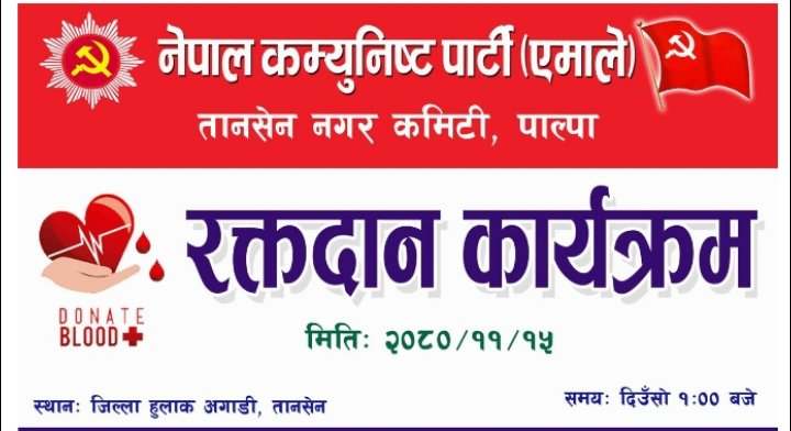 पाल्पा-नेपाल कम्युनिष्ट पार्टी (एमाले) तानसेन नगरकमिटी पाल्पाले माघ १५ गते अर्थात भोली सोमबार रक्तदान कार्यक्रम गर्ने भएको छ ।