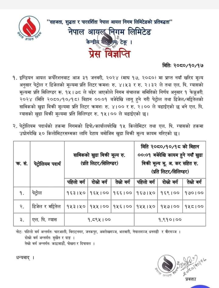 इन्डियन आयल कर्पोरेसनबाट बुधवार प्राप्त नयाँ खरिद मूल्य अनुसार पेट्रोलियम पदार्थको मूल्य वृद्धि गरिएको निगमले जनाएको छ ।