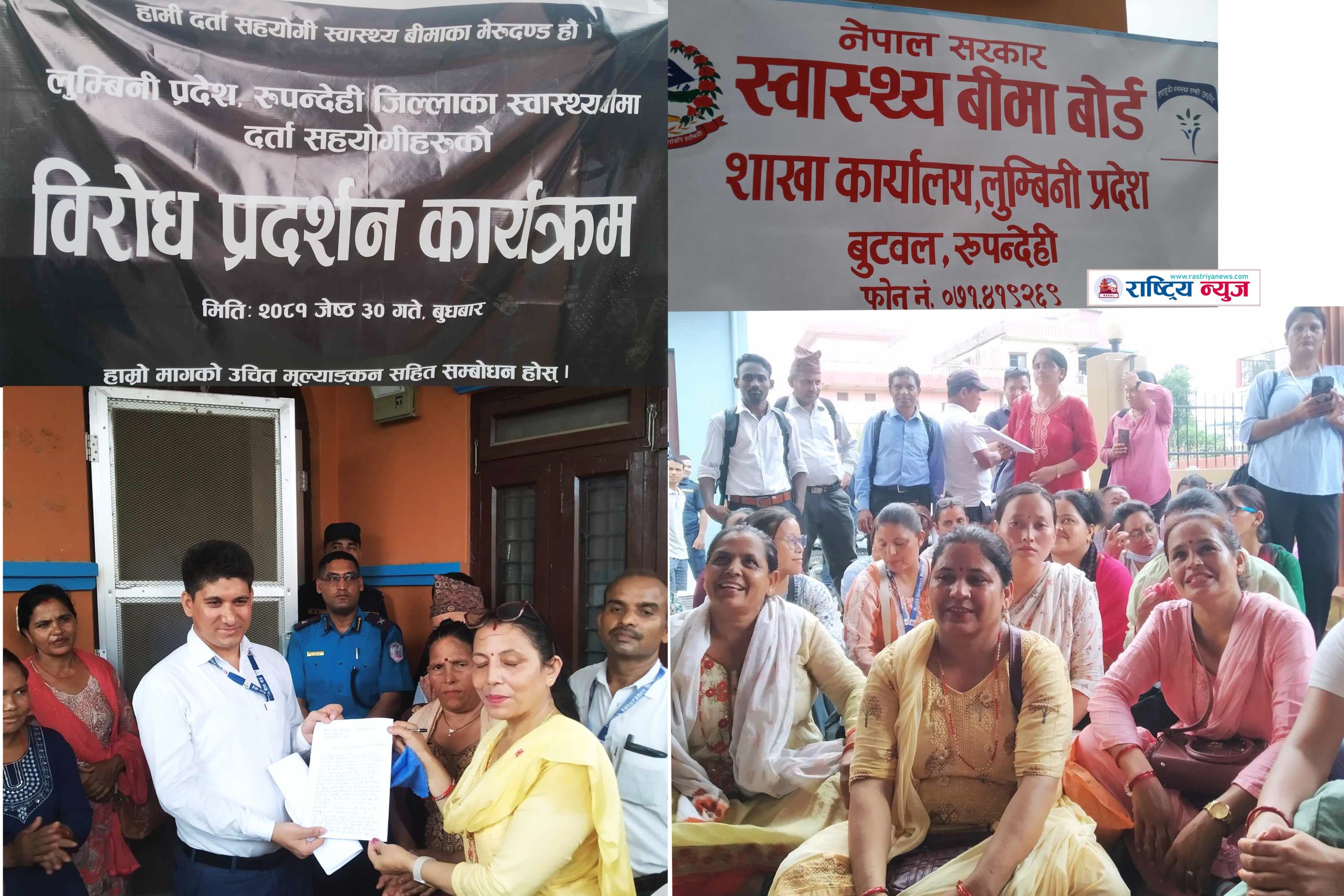 स्वास्थ्य बिमा सहजकर्ताको परिवारलाई नि:शुल्क स्वास्थ्य बिमा हुनुपर्ने ,स्वास्थ्य बिमाका सहजकर्ताको प्रोत्साहन रकम १० प्रतिशत बाट वृद्धि गरि २० प्रतिशत हुनुपर्ने र सहजकर्ताहरुको कार्य सम्पादनको आधारमा मासिक तलबको ब्यवस्था गर्नुपर्ने लगाएतका माग राखि स्वास्थ्य बिमा बोर्ड शाखा कार्यालय लुम्बिनी प्रदेसका संयोजक जनक साउथ लाई ज्ञापन पत्र बुझाएका छ्न। उनिहरुले आफ्नो माग सम्बोधन नभए थप आन्दोलन र बिरोध कार्यक्रम गर्न बाध्य हुने बताएका छ्न। सहजकर्ताहरुले लुम्बिनी प्रदेशको बिमा बोर्डको शाखा कार्यालयमा तालाबन्दी समेत गरेका थिए ।