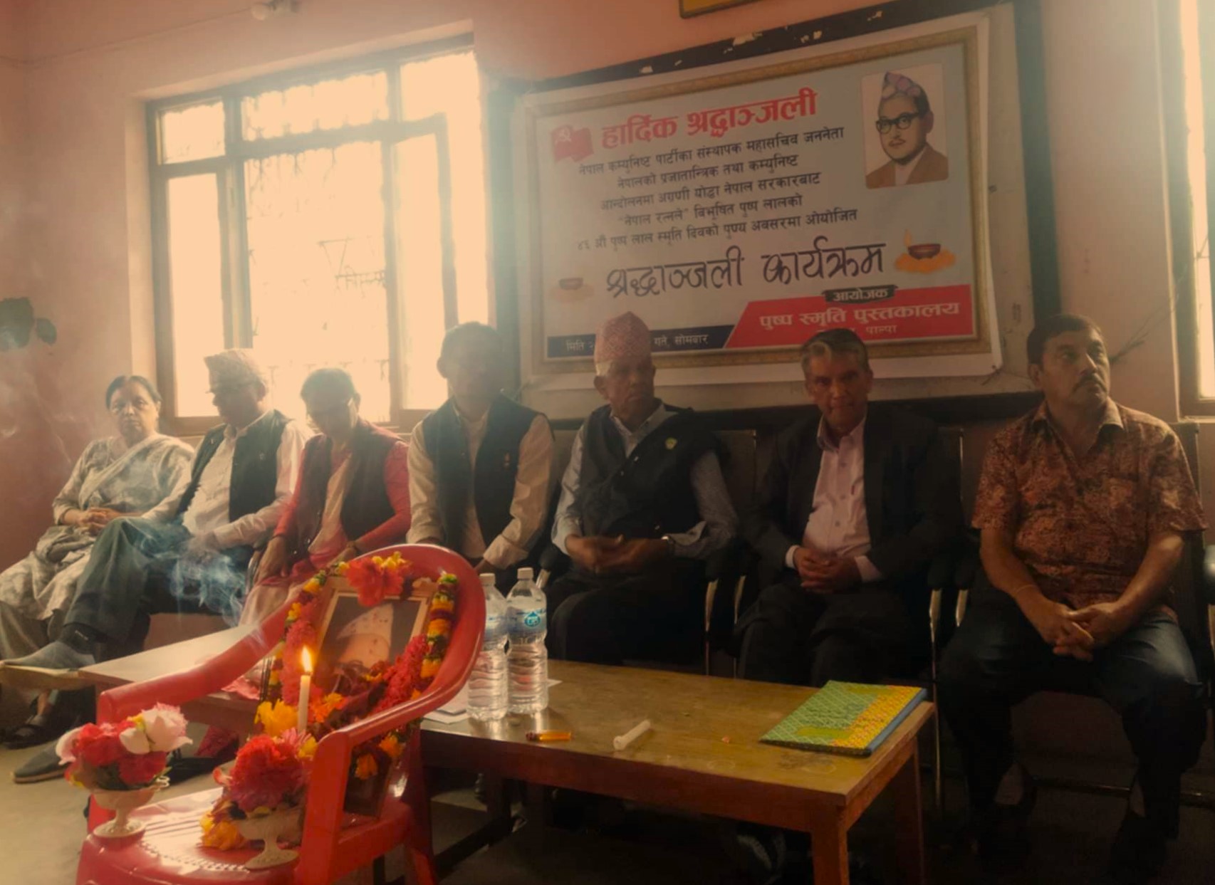 साउन ७ पाल्पा - नेपाल कम्युनिस्ट पार्टीका सस्थापक महासचिव पुस्पलाल को ४६ औं स्मृति दिवस को अबसर मा पुस्पलाल स्मृति पुस्तकालय को आयोजना श्रदान्जलि कार्यक्रम गरि मनायको छ ।कार्यक्रम का प्रमुख अतिथि ने क पा एमाले का केन्द्रिय सल्लाहकार तथा बरिस्ठ पत्रकार मेघराज शर्मा ले स्व पुस्पलाल को योगदान को चर्चा गर्नु हुदै कम्युनिस्ट पार्टी प्रति प्रतिबद्ध सिदान्तनिस्ठ भएको बताउनु भयो । प्रमुख अतिथि शर्मा ले पुस्प लाल सिदान्त , संगठन , र सघर्ष अटल रहि राणा जहानिया साशन को बिरोध गर्दै पार्टी लाइ अगाडि बढायकै कारण बर्तमान कम्युनिस्ट यो अबस्थामा पुगेको भन्नु हुदै भावपुर्ण श्रद्धाञ्जली व्यक्त गर्नु भएको थियो।